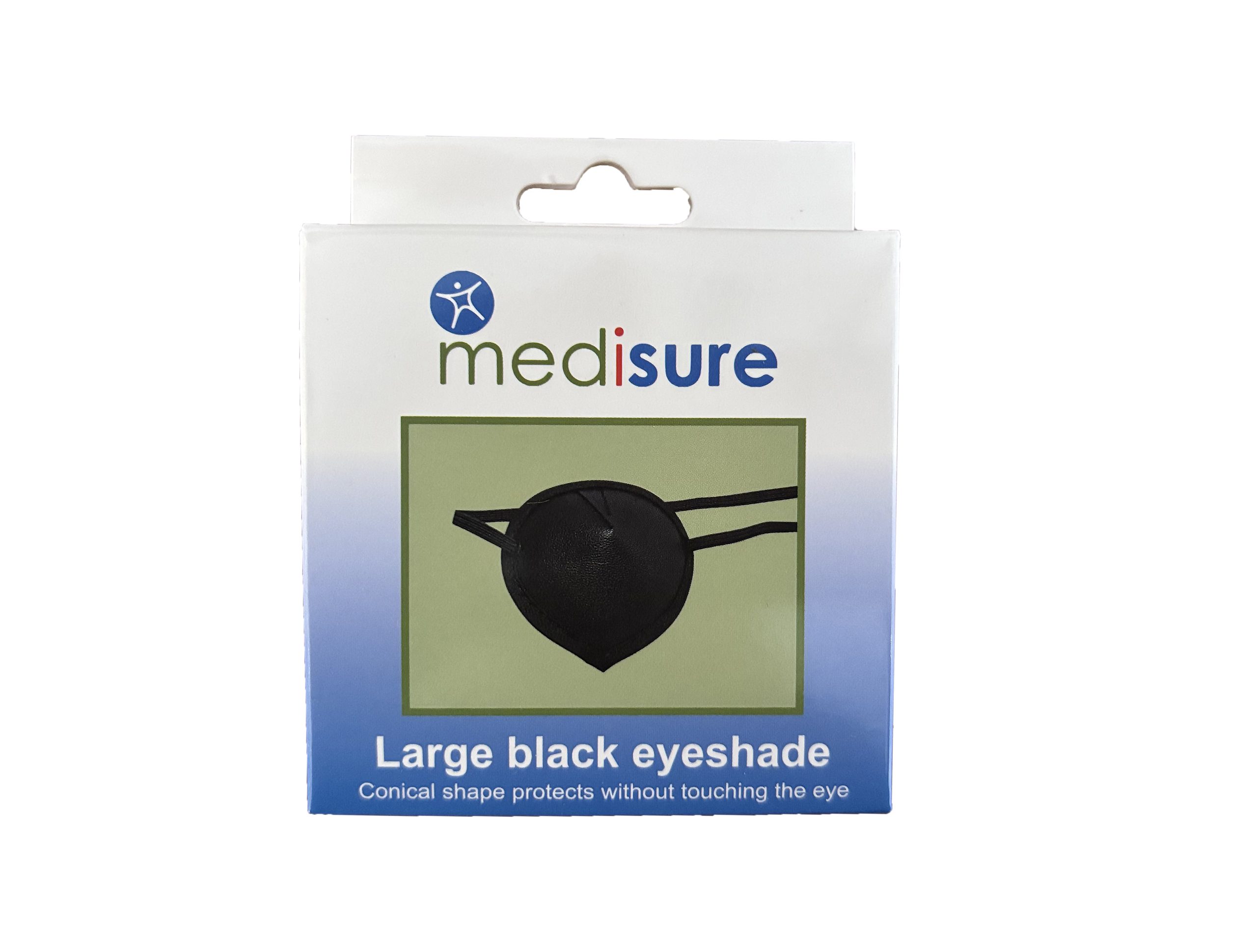 The Medisure Large Black Eyeshade is made of soft PVC leatherette, formed into a conical / convex shape to provide protection from light and cold without touching the eye.